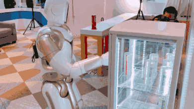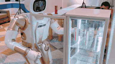 Walker新一代實現(xiàn)了手眼協(xié)調(diào)操作。其具備一對7自由度機械臂,實現(xiàn)了更大的手臂操作空間,擁有靈活的操作能力以及避障能力。通過與自身視覺感知、力感知的配合,Walker可以獲得外部運動物體的位置及姿態(tài)信息,實時地配合運動物體進行相應(yīng)的操作,從而實現(xiàn)手眼協(xié)調(diào)操作的功能。例如,Walker可以打開冰箱門并從中取出飲品。