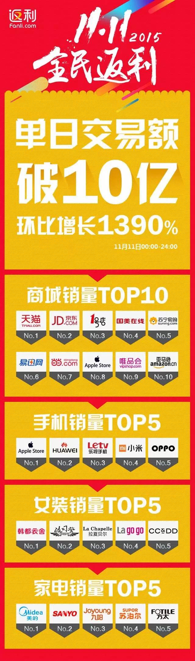 11月12日消息,電商導購平臺返利網(wǎng)公布了今年“雙11網(wǎng)購狂歡節(jié)”的業(yè)績:11月11日0點至24點,返利網(wǎng)平臺交易額突破10億元,環(huán)比增長1390%,成為各大電商重要的引流平臺。