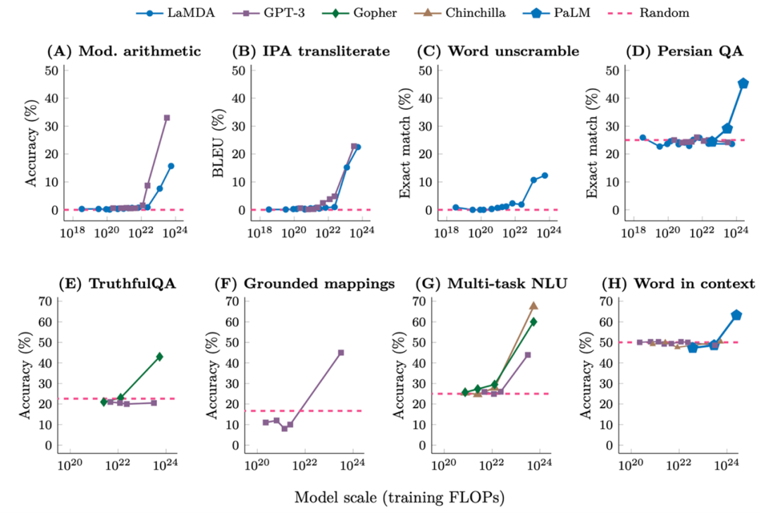 同樣,論文Emergent Abilities of Large Language Models中也有類似的實驗證明,當模型達到臨界大小時,許多NLP能力會不可預測地出現(xiàn)——涌現(xiàn)規(guī)律。