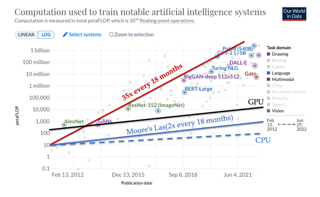 2012年至今,表現(xiàn)最好的模型參數(shù)每18個月增加35倍,增速遠超摩爾定律