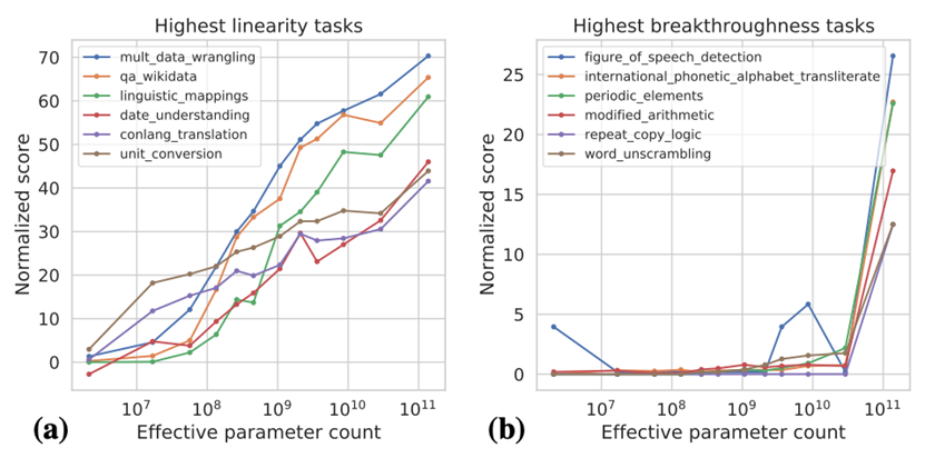 在最新的一篇關于大模型的研究論文中,作者通過實驗證明了大多數(shù)任務的效果隨著模型的增大而提高——在一些任務中,隨著模型增大而效果類似線性相關地變好的情況,作者將這類任務定義為Linearity Tasks,同樣,也有一些任務需要模型規(guī)模超過某個臨界點后,會突然出現(xiàn)相應的能力,此后在隨著模型規(guī)模的增大而提升效果,作者將這類任務定義為Breakthroughness Tasks。(當然,也存在少部分任務的效果隨著模型增大而降低)。