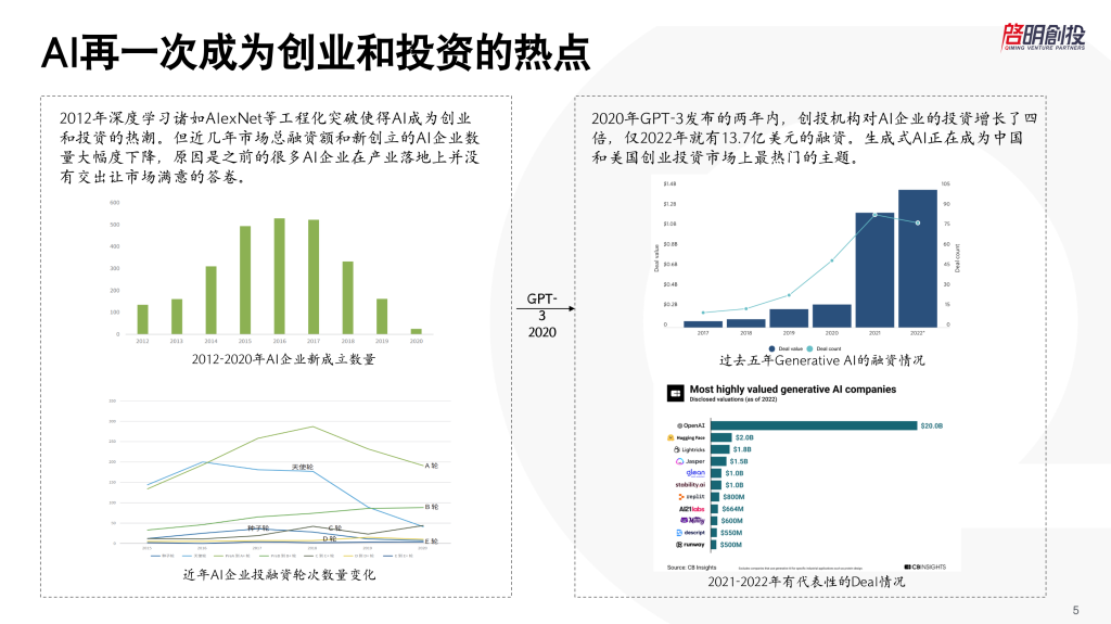 隨著大模型和生成式AI浪潮爆發(fā),AI再次成為創(chuàng)業(yè)和投資的熱點。2020年GPT-3發(fā)布的兩年內(nèi),全球創(chuàng)投機構(gòu)對AI企業(yè)的投資增長了4倍,僅2022年就有13.7億美元的融資。