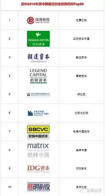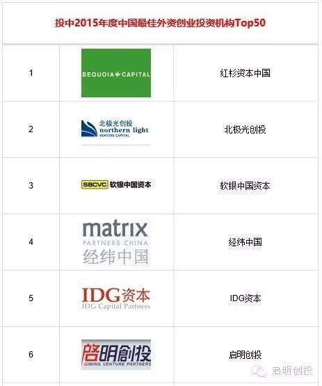 在昨天中午“投中2015年度年度榜”揭曉,啟明位列“投中2015年度中國最佳創(chuàng)業(yè)投資機(jī)構(gòu)Top50”第10位,同時位列“投中2015年度中國最佳外資創(chuàng)業(yè)投資機(jī)構(gòu)Top50”第6位。
