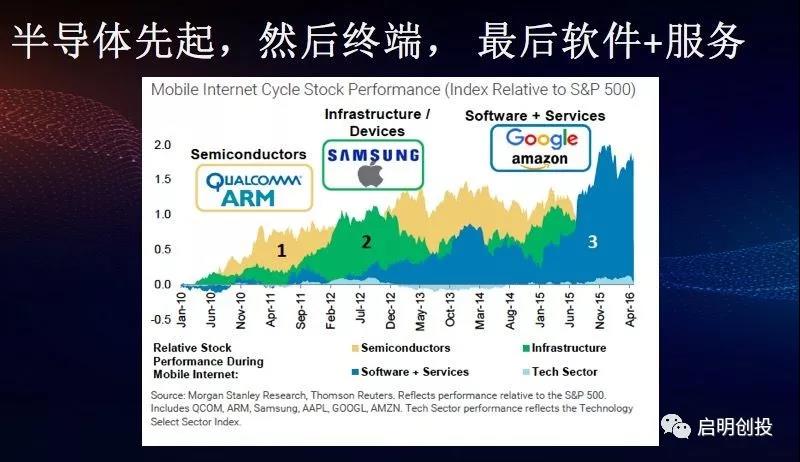 這個(gè)互聯(lián)網(wǎng)第一波興起的股票走勢(shì)是像高通這樣的公司,大家知道這個(gè)公司的芯片支持了整個(gè)智能手機(jī)的興起。第二個(gè)興起的是賣手機(jī)的群體,我在這里面沒有放中國(guó)公司,但是你可以聯(lián)想一下華為和小米。總的來(lái)說(shuō),芯片業(yè)會(huì)先起來(lái),手機(jī)業(yè)(終端)會(huì)再起來(lái),最終起來(lái)的才是服務(wù)業(yè)。這個(gè)很容易理解。從黑科技賦能,它中間有一個(gè)生態(tài)鏈。你永遠(yuǎn)會(huì)有時(shí)間軸或者生態(tài)鏈,生態(tài)連是需要時(shí)間養(yǎng)成的。