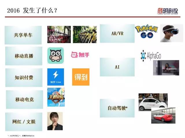桔說(shuō)的春季論壇主題是對(duì)2016的回顧以及對(duì)2017的展望。那么2016年發(fā)生了什么?我在啟明創(chuàng)投的主要關(guān)注點(diǎn)在消費(fèi)互聯(lián)網(wǎng)領(lǐng)域——和消費(fèi)、和互聯(lián)網(wǎng)有關(guān)。所以我的關(guān)注點(diǎn)更多集中這個(gè)方面。