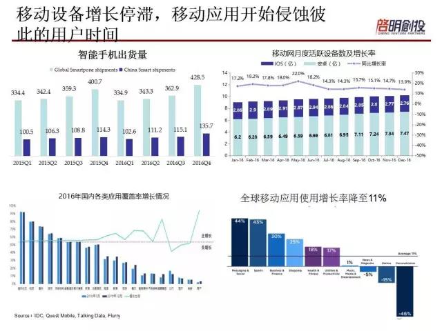 整體來(lái)看的話,基本是此消彼漲的情況,全球移動(dòng)應(yīng)用使用增長(zhǎng)率,2015年數(shù)字比2016要快很多,現(xiàn)在的11%對(duì)于我們這個(gè)行業(yè)來(lái)說(shuō)是非常低的數(shù)字。我們現(xiàn)在確實(shí)進(jìn)入移動(dòng)互聯(lián)網(wǎng)發(fā)展的一個(gè)相對(duì)飽和的時(shí)機(jī)。