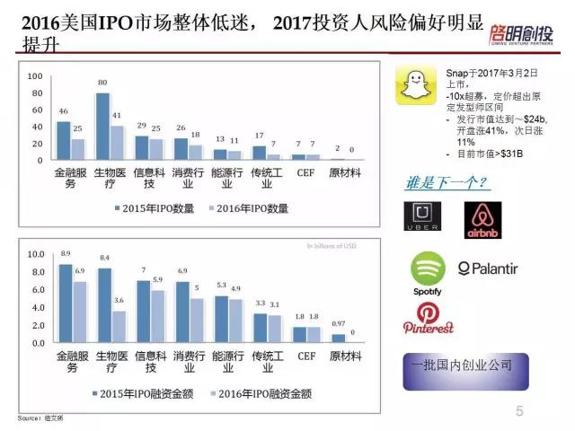 是紐交所的數(shù)據(jù),紐交所統(tǒng)計(jì)2015、2016年整體IPO數(shù)量和金額明確的表現(xiàn)是在各個(gè)領(lǐng)域都有下降。但現(xiàn)在這個(gè)情況其實(shí)已經(jīng)發(fā)生了變化——最近有代表性的事件就是Snap上市,它上市的時(shí)候一些媒體提出了對(duì)于它在面臨臉書(shū)競(jìng)爭(zhēng)的情況下,對(duì)它未來(lái)長(zhǎng)期增長(zhǎng)很多的顧慮。但是Snap在路演過(guò)程中就獲得十倍的超額訂購(gòu),它當(dāng)時(shí)最高定價(jià)16美元,后來(lái)是17美元,發(fā)行市值240億美元,而發(fā)行第一天上漲44%,次日再漲15%。
