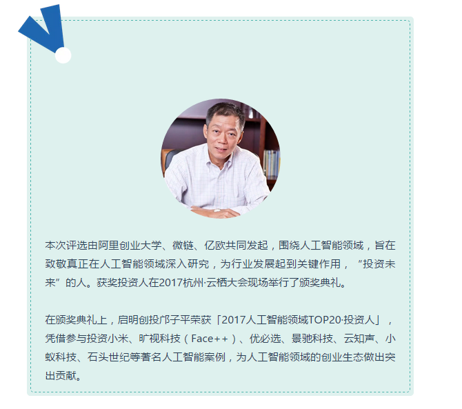 通過本次「2017人工智能領域TOP20·投資人」活動,在聚集了全國上萬創(chuàng)投精英的云棲大會現(xiàn)場頒獎,表彰與致敬了那些真正深耕人工智能領域的投資人,是鼓勵更多具有冒險創(chuàng)新精神的投資新力量誕生,也是在邀請更多人參與和開啟這個屬于人工智能領域的大時代。