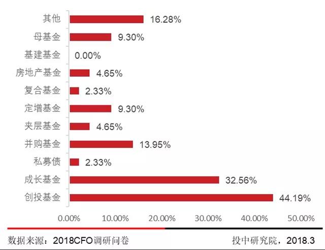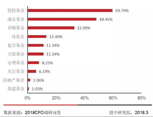 59.79%的CFO所在機構正在募集創(chuàng)投基金(Venture),其次為成長基金(Growth)以及并購基金(Buyout)。2018年《政府工作報告》中明確提出的“將創(chuàng)業(yè)投資、天使投資稅收優(yōu)惠政策試點范圍擴大到全國”以及證監(jiān)會推出創(chuàng)投基金退出的反向倒掛政策,將直接影響VC/PE機構募集重點轉向以創(chuàng)投基金為主。