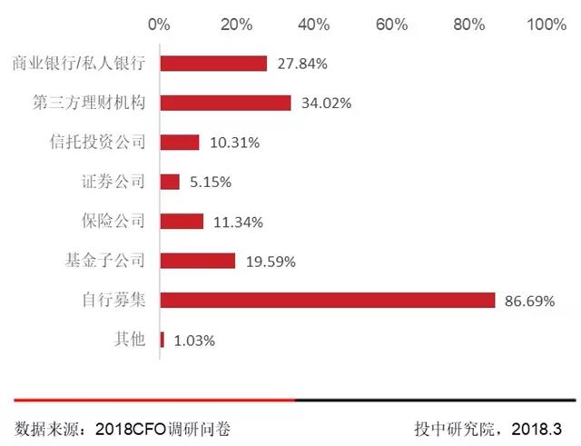 89.69%的CFO表示其所在機構將首先選擇通過自行向投資投資者或高凈值個人募集資金的方式成立新基金,其次有34.02%的機構考慮尋求第三方理財機構的協(xié)助。與投中研究院2017年發(fā)布的GP調(diào)研結果相比,選擇銀行、信托、證券、保險等金融機構的人數(shù)呈現(xiàn)下降狀態(tài)。投中研究院認為,2018年隨著金融監(jiān)管進一步加強,傳統(tǒng)的銀行和保險等機構投資者出資將呈下降趨勢,未來VC/PE機構通過第三方理財機構通道募集高凈值個人資金和企業(yè)資金將呈上升趨勢。