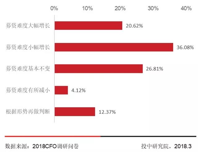 36.08%的CFO認為與上年相比,本年度基金募資難度將有小幅增長,20.62%的CFO認為募資難度將有顯著增加,而只有4.12%的受訪者持樂觀態(tài)度??傮w來看,近六成的CFO對2018年募資信心下滑。