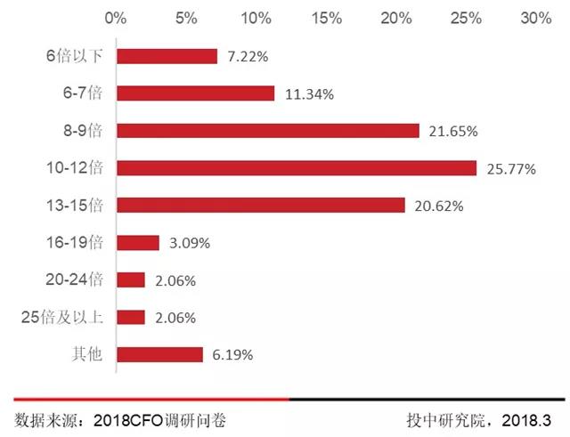 (3)近半數(shù)的CFO們對于項目估值使用的市盈率倍數(shù)集中于8-15倍之間。