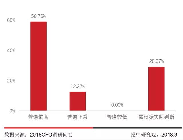 從CFO對市場估值的評價來看,58.8%的CFO認為2017年市場對于項目估值偏高,且在對2018年的預估中,仍有35.05%的CFO認為該指標將會持續(xù)走高。這一情況說明CFO們對于當前市場投資環(huán)境過熱持有較為明確的看法,同時可以推斷CFO認為較為理想的平均市盈率水平應至少低于10倍。CFO們對于市場估值過高的判斷反映了他們對于投資風險的謹慎態(tài)度,因為過高的項目估值市盈率可能會對二級市場的利潤空間形成擠壓效應,從而對未來項目的退出產(chǎn)生不利影響。