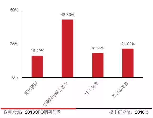 據(jù)調(diào)研結果顯示,43.3%的受訪CFO表示2017年所投項目的退出回報水平與年初預期無明顯差異,另有16.49%的CFO表示其所在機構去年退出回報超出預期。