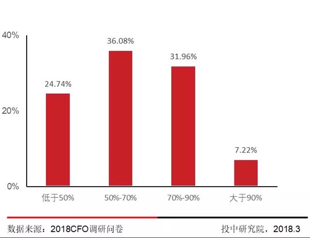 調(diào)研結果表明,36.8%的CFO表示其所在基金管理機構的管理費用占整個運營成本的50%-70%,31.96%的受訪者表示管理費用可達運營成本的70%-90%,另有24.74%CFO表示管理費用比例低于運營成本50%。機構管理費用占運營成本50%-70%是目前的主流趨勢。