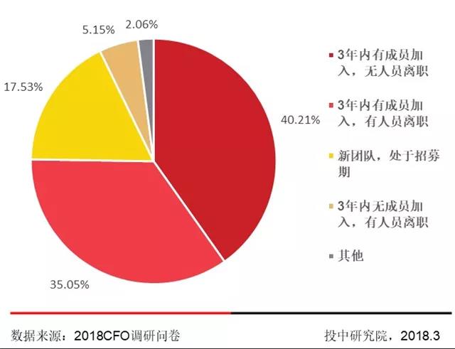 調(diào)研結果顯示,約80%的CFO及其團隊近三年來都有人員變動的情況發(fā)生,其中僅有成員加入的比例約占50%,僅有成員離職的比例約6.41%。總體來看,人員招聘力度遠遠大于人員流失力度,這也從側面反映出過去三年基金對CFO及財務團隊需求呈上升趨勢。