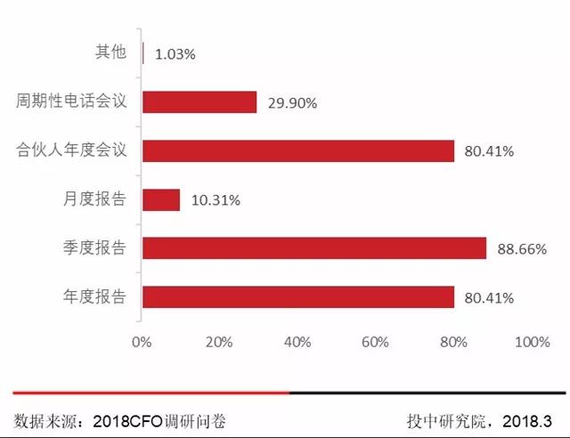 調(diào)研結果顯示,超過80%的受訪者所在機構會選擇采用季度報告、年度報告以及合伙人大會的形式向LP披露信息,此三種方式也是目前市場上通行做法中的主流方式。除此之外還會有近三成的CFO選擇通過周期性電話會議的方式進行補充匯報交流。