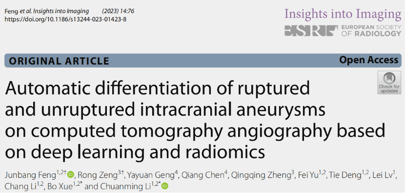 在啟明創(chuàng)投投資企業(yè)數(shù)坤科技的助力下,重慶大學(xué)附屬中心醫(yī)院醫(yī)學(xué)影像科、重慶市急救醫(yī)療中心醫(yī)學(xué)影像科、重慶醫(yī)科大學(xué)附屬第二醫(yī)院放射科的專(zhuān)家利用深度學(xué)習(xí)和影像組學(xué)技術(shù)自動(dòng)檢測(cè)和區(qū)分破裂和未破裂的顱內(nèi)動(dòng)脈瘤,其科研論文近期被歐洲放射學(xué)會(huì)(ESR)期刊Insights into Imaging收錄。