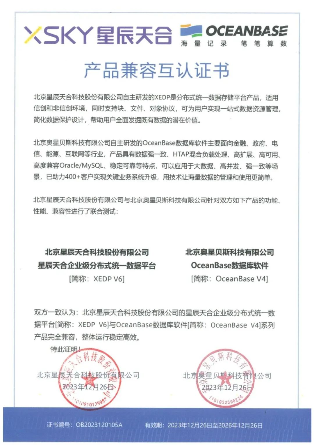 雙方有著長(zhǎng)期穩(wěn)定的合作,在2023年年初,雙方已經(jīng)基于OceanBase V3完成兼容性認(rèn)證,聯(lián)合解決方案在多個(gè)重要客戶(hù)中得到了部署。此次基于OceanBase V4的兼容性認(rèn)證完成,意味著XSKY星辰天合與OceanBase的進(jìn)一步深入合作,雙方攜手推出的聯(lián)合解決方案,將服務(wù)于更多客戶(hù)的關(guān)鍵業(yè)務(wù)領(lǐng)域,推動(dòng)數(shù)字化轉(zhuǎn)型。