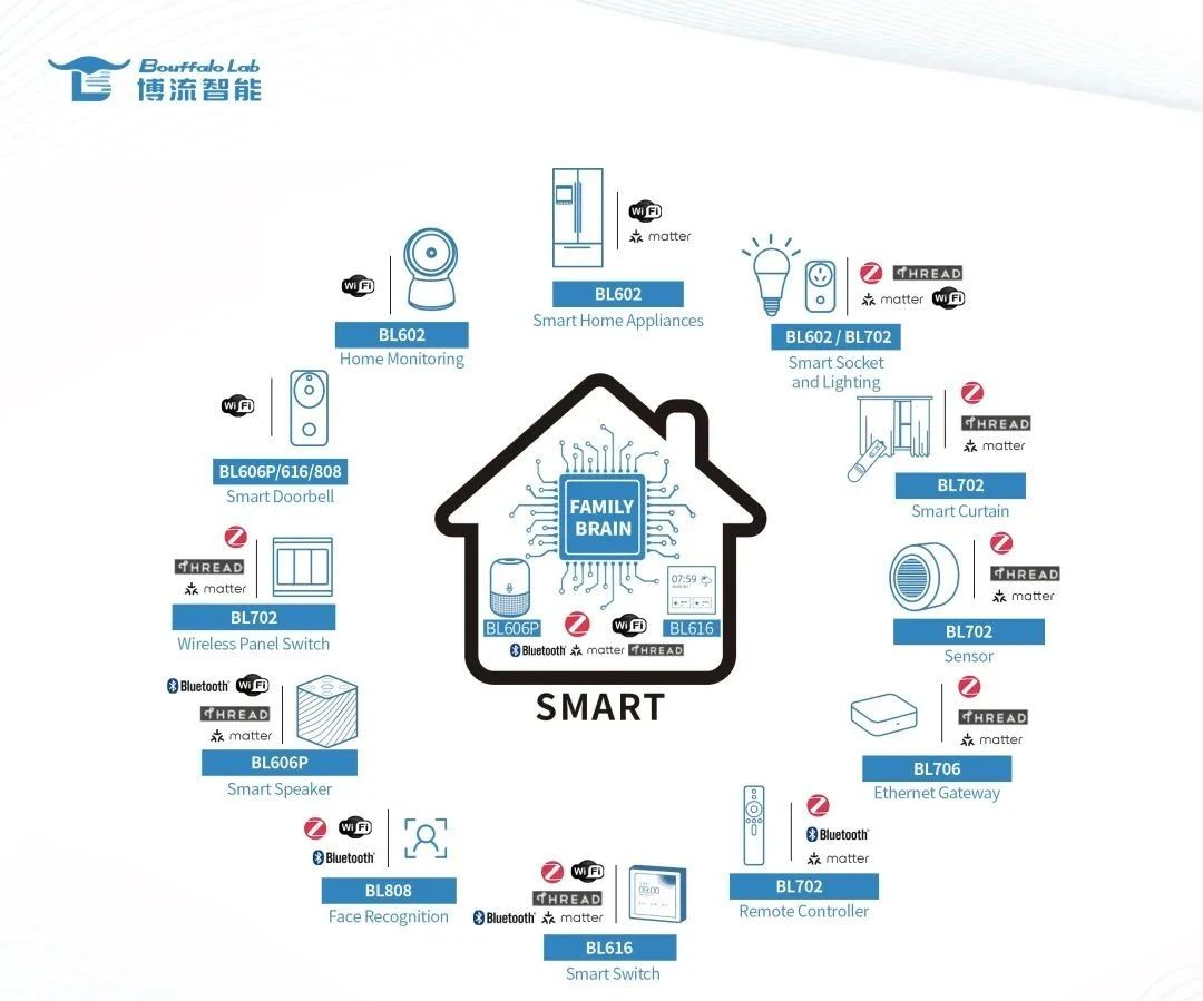 Matter協(xié)議是CSA連接標準聯(lián)盟于2021年推出的應用層連接協(xié)議,旨在通過構(gòu)建統(tǒng)一“語言”,消除不同生態(tài)間兼容性痛點,解決智能家居碎片化難題。博流智能是Google Matter生態(tài)芯片的早期合作伙伴,能夠提供芯片級完整解決方案,是全球極少數(shù)能夠同時提供WiFi Matter(BL602)和Thread Matter(BL702)的芯片設計公司。