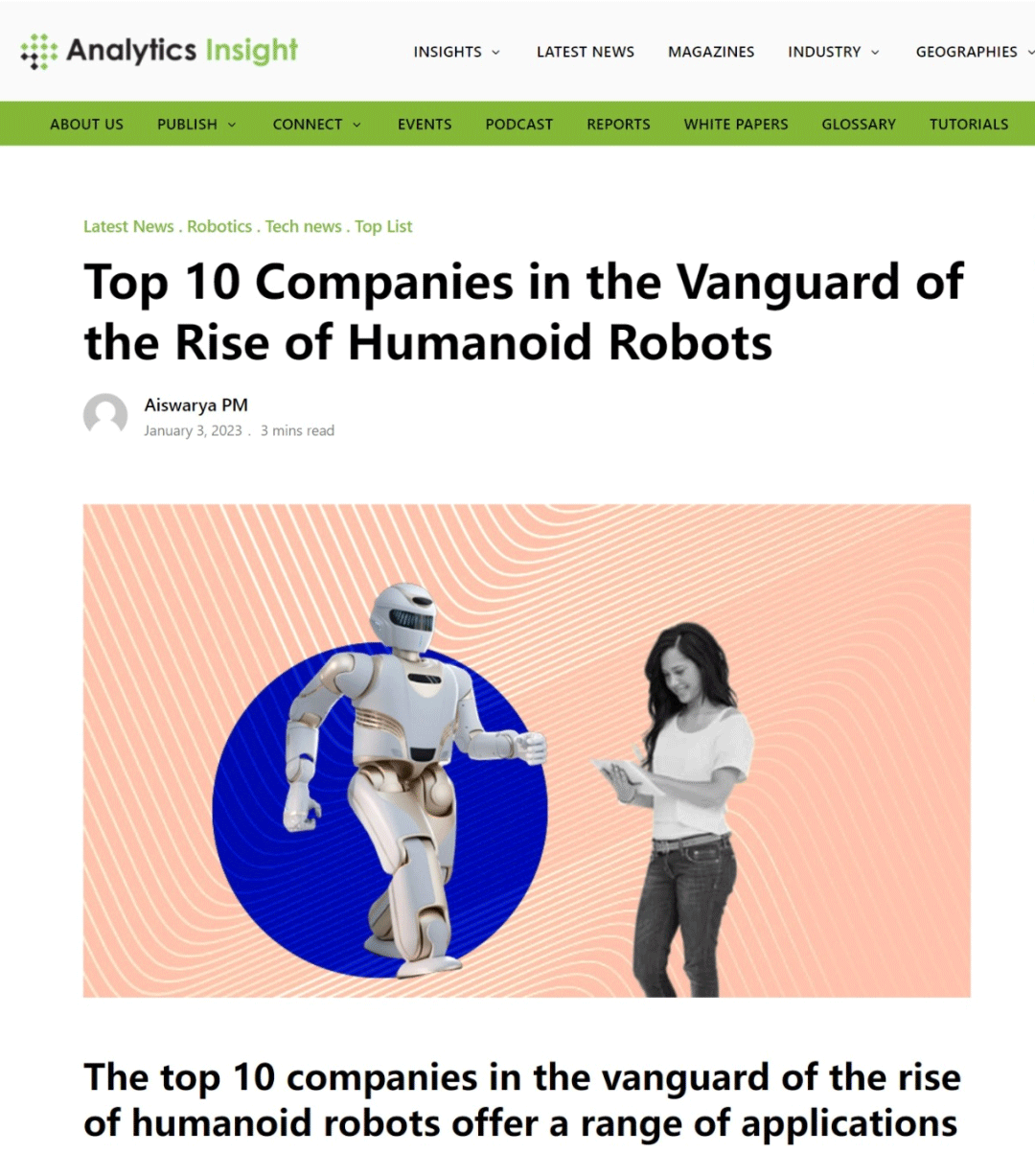 近日,Analytics Insight雜志發(fā)布十大崛起的人形機器人先鋒公司榜單,啟明創(chuàng)投投資企業(yè)優(yōu)必選與其他全球知名公司共同入選。值得一提的是,優(yōu)必選已連續(xù)三年入選Analytics Insight雜志發(fā)布的榜單,此前榮膺2022年更受矚目的十大機器人公司以及美國市場十大領先機器人公司。