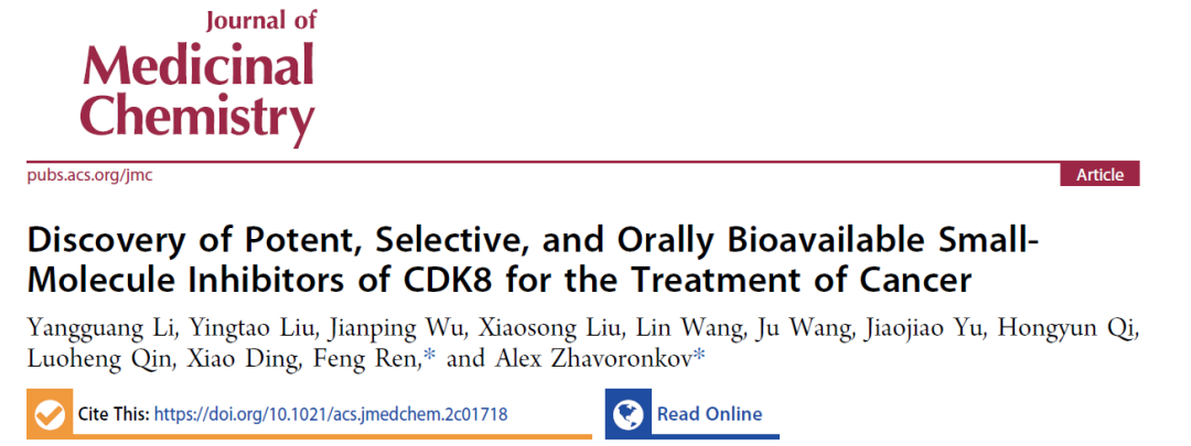 日前,啟明創(chuàng)投投資企業(yè)英矽智能宣布,通過多模態(tài)生成式強(qiáng)化學(xué)習(xí)平臺(tái)Chemistry42基于結(jié)構(gòu)生成化學(xué)分子的藥物設(shè)計(jì)方法,成功發(fā)現(xiàn)一款有效的、具有選擇性的、口服CDK8抑制劑,有潛力用于癌癥的治療。該研究發(fā)表在藥物化學(xué)領(lǐng)域頂尖期刊美國化學(xué)會(huì)下屬Journal of Medicinal Chemistry期刊上。(2022年影響因子:8.039)
