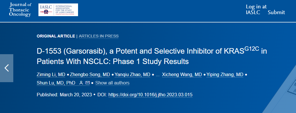 該項(xiàng)研究是由上海市胸科醫(yī)院陸舜教授作為主要研究者牽頭開展的一項(xiàng)單臂、多中心I/II期臨床試驗(yàn)。研究結(jié)果顯示,D-1553(Garsorasib)在攜帶KRAS G12C突變的非小細(xì)胞肺癌(NSCLC)患者中具有良好的安全性和抗腫瘤活性。