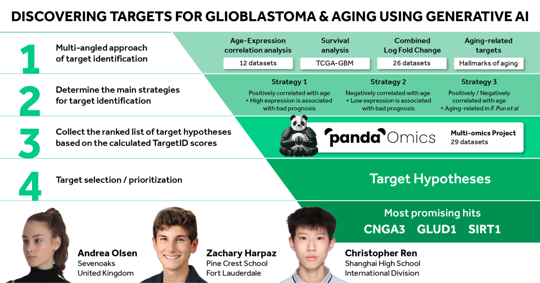 日前,啟明創(chuàng)投投資企業(yè)英矽智能宣布,在其自主研發(fā)的人工智能靶點發(fā)現(xiàn)平臺PandaOmics的幫助下,來自挪威奧斯陸、美國佛羅里達和中國上海的三位高中學生識別出三個全新的針對衰老和膠質(zhì)母細胞瘤(GBM)的潛在雙效靶點:CNGA3、GLUD1、SIRT1。該研究成果近日發(fā)表在專注衰老領域的期刊Aging上。