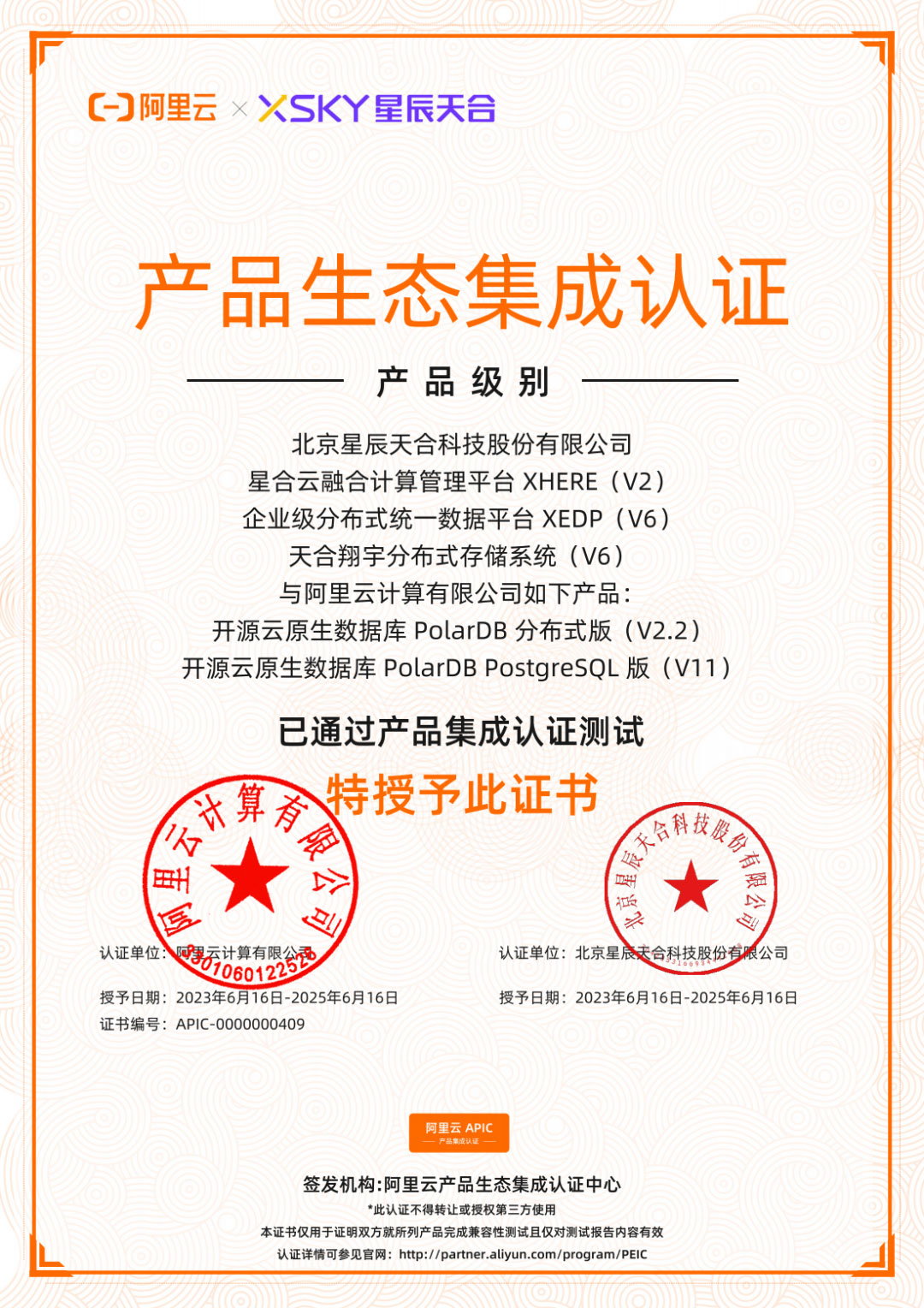 測(cè)試結(jié)果表明,XSKY星辰天合旗下的融合計(jì)算管理平臺(tái)XHERE(V2)、統(tǒng)一數(shù)據(jù)平臺(tái)XEDP(V6)、天合翔宇分布式存儲(chǔ)系統(tǒng)(V6)與阿里云的開(kāi)源云原生數(shù)據(jù)庫(kù)PloarDB分布式版(V2.2)以及開(kāi)源云原生數(shù)據(jù)庫(kù)PolarDB PostgreSQL(V11),完全滿足產(chǎn)品兼容認(rèn)證要求,兼容性良好,系統(tǒng)運(yùn)行穩(wěn)定。