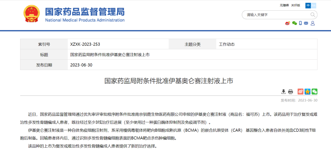 近日,中國(guó)國(guó)家藥品監(jiān)督管理局(NMPA)官網(wǎng)顯示,啟明創(chuàng)投投資企業(yè)邁杰轉(zhuǎn)化醫(yī)學(xué)的合作伙伴馴鹿生物申報(bào)的伊基奧侖賽注射液(商品名:福可蘇?)正式獲批上市。該藥品用于治療復(fù)發(fā)或難治性多發(fā)性骨髓瘤成人患者,既往經(jīng)過(guò)至少3線治療后進(jìn)展(至少使用過(guò)一種蛋白酶體抑制劑及免疫調(diào)節(jié)劑)。