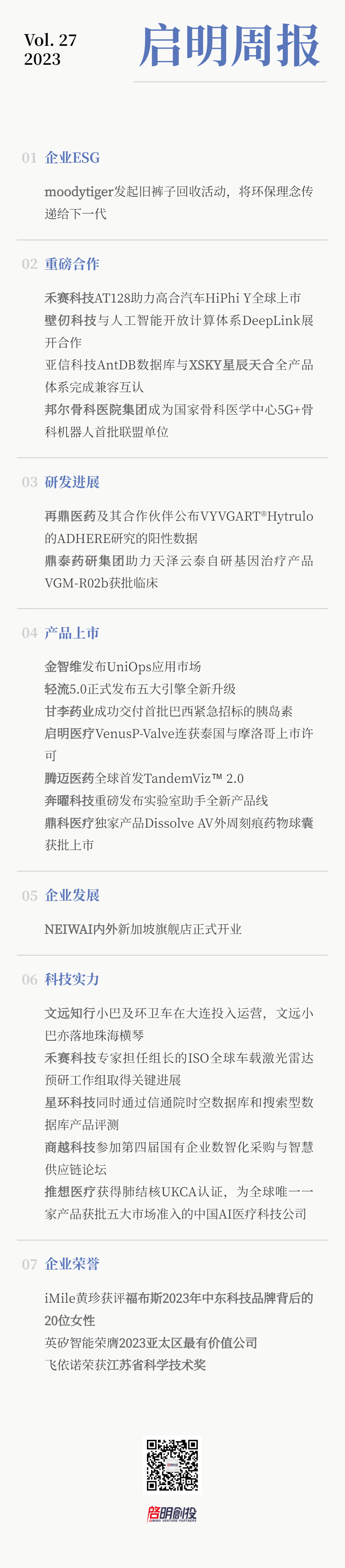 編者按:“啟明周報(bào)”欄目會(huì)在每周定期發(fā)布,盤(pán)點(diǎn)啟明創(chuàng)投投資企業(yè)的融資新聞、發(fā)展動(dòng)態(tài)。