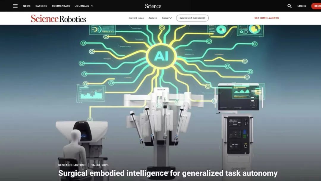 該突破性的研究成果以《手術(shù)具身智能在腹腔鏡機器人輔助手術(shù)中的通用任務(wù)自動化》為題發(fā)表在機器人領(lǐng)域頂級權(quán)威期刊Science Robotics(影響因子:27.5,5年影響因子:32.9)。這是中國腔鏡手術(shù)機器人在具身智能領(lǐng)域首次完成活體動物實驗,并驗證多任務(wù)自主操作與人機協(xié)作能力,標志著中國手術(shù)機器人自主化技術(shù)在通用性與實用性的驗證上邁出關(guān)鍵一步,彰顯了中國企業(yè)在具身智能手術(shù)機器人領(lǐng)域的技術(shù)突破與垂直整合實力,引領(lǐng)行業(yè)朝著更智能、更協(xié)同、更普惠的方向加速演進。