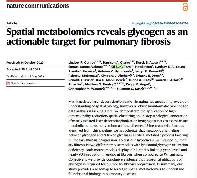 近日,啟明創(chuàng)投投資企業(yè)锘崴科技科學家及其合作團隊在Nature Communications發(fā)表了題為《空間代謝組學揭示糖原是肺纖維化的可行靶點》的研究論文。