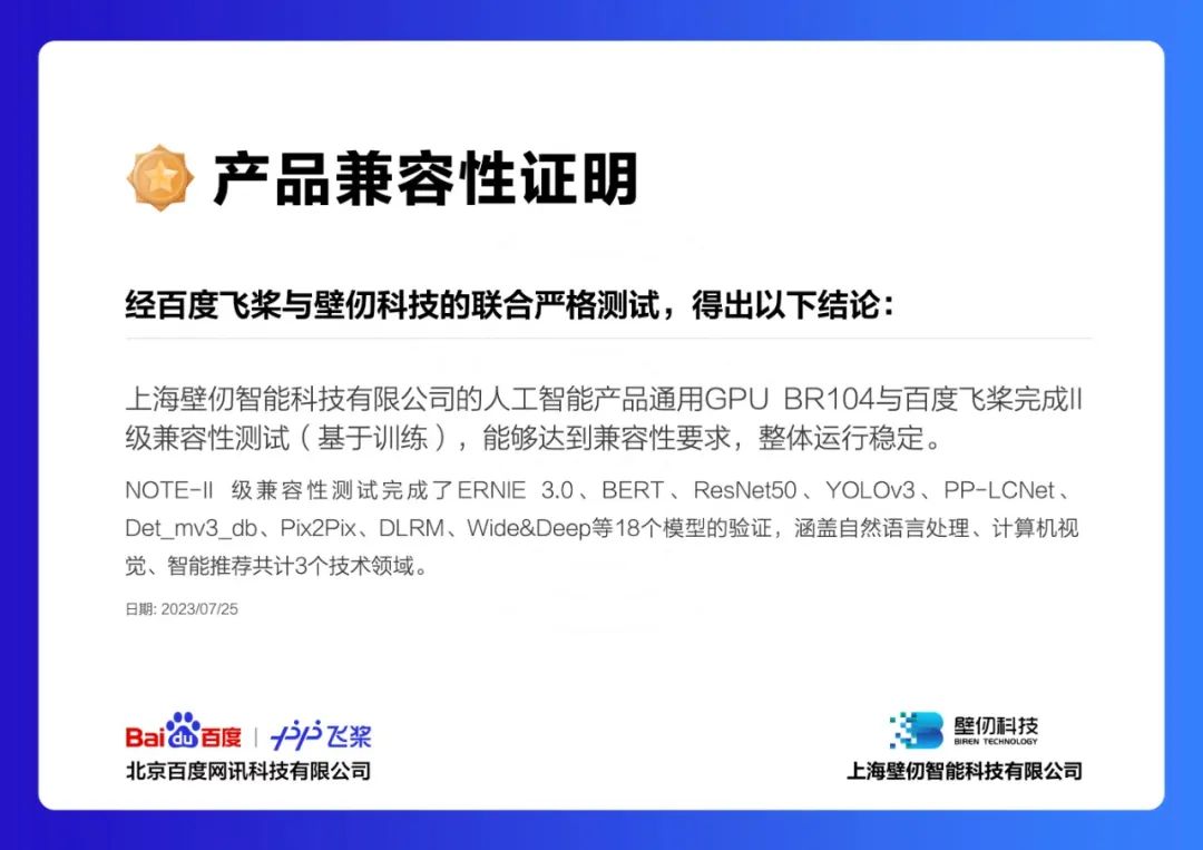 自壁仞科技加入由飛槳發(fā)起的硬件生態(tài)共創(chuàng)計劃后,雙方取得了一系列階段性成果。近日,壁仞科技BR104通用GPU與百度飛槳已完成II級兼容性測試。本次II級兼容性測試完成了涵蓋自然語言處理、計算機視覺、智能推薦共計3個技術領域的18個模型的驗證。經(jīng)過雙方聯(lián)合嚴格測試表明,壁仞科技的BR104通用GPU在上述18個模型上的精度、速度等各方面表現(xiàn)滿足要求,與飛槳的兼容性良好,整體運行穩(wěn)定,達到了II級適配互認要求,可以滿足用戶的應用需求。
