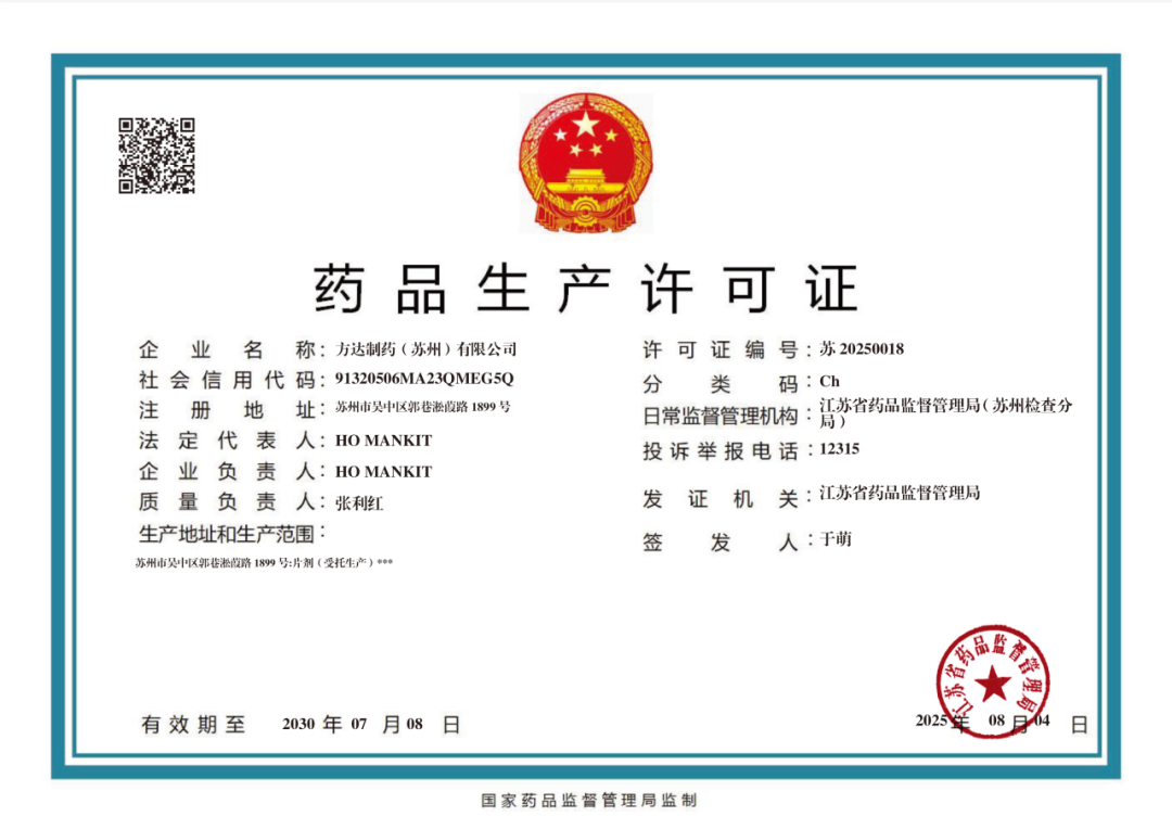 方達醫(yī)藥獲得藥品生產(chǎn)許可證與CNAS認證