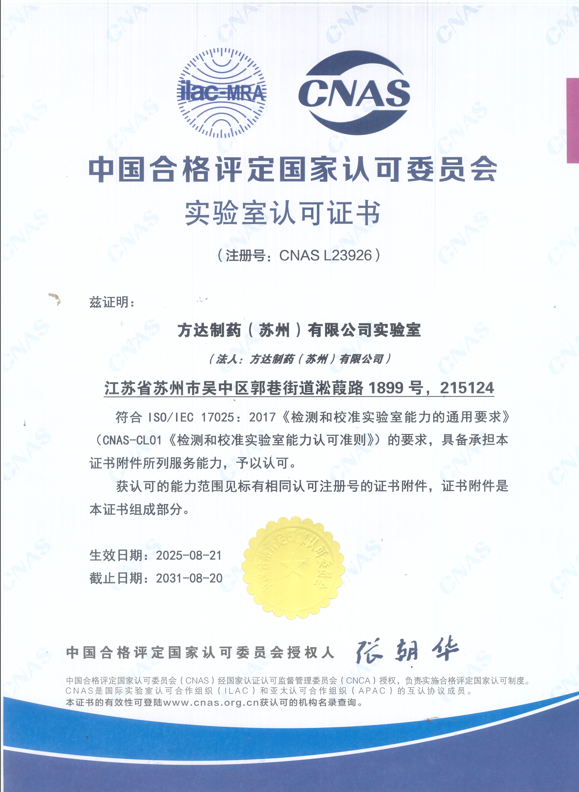 方達制藥分析檢測中心成功取得CNAS認可,表明其質(zhì)量管理與技術(shù)能力符合國際標(biāo)準,可為項目提供具有公信力的檢測數(shù)據(jù),顯著增強藥品申報材料的可靠性與合規(guī)性,加速注冊進程。