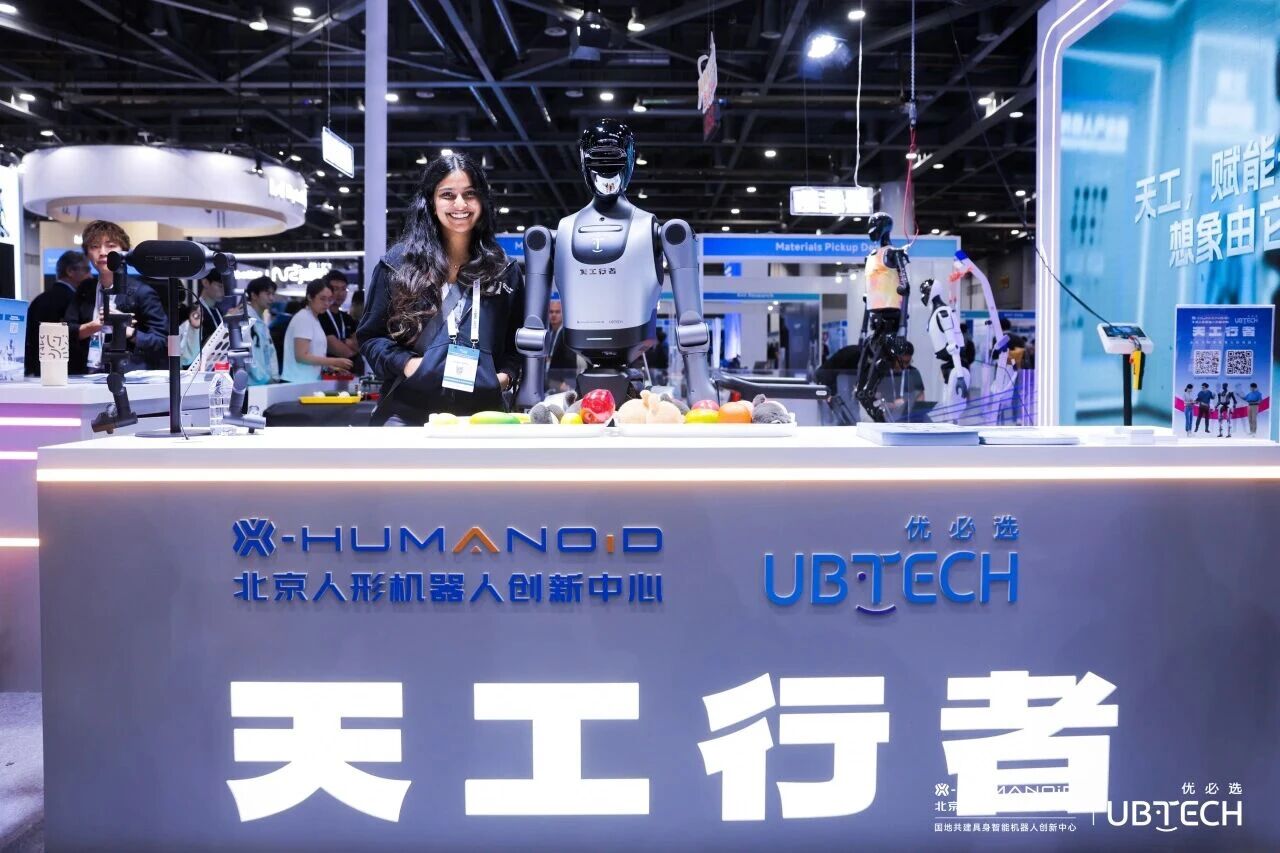 在展區(qū),優(yōu)必選攜北京人形機器人創(chuàng)新中心聯(lián)合展出具身天工、慧思開物、天工行者等重磅產(chǎn)品,全方位呈現(xiàn)全尺寸人形機器人前沿技術(shù)、創(chuàng)新成果及開發(fā)者生態(tài)。