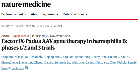 日前,啟明創(chuàng)投投資企業(yè)、專注前沿基因治療領(lǐng)域的創(chuàng)新型企業(yè)信念醫(yī)藥宣布,公司研發(fā)生產(chǎn)的基因治療藥物信玖凝?(BBM-H901注射液,通用名稱:波哌達(dá)可基注射液)治療成人血友病B的I/II期和III期(CTR20212816)臨床研究結(jié)果以及研究者發(fā)起的臨床研究(IIT)的長期隨訪結(jié)果在國際權(quán)威期刊Nature Medicine(IF=50)正式發(fā)表,題為“Factor IX Padua gene therapy in hemophilia B: phase 1/2 and 3 trials”。該研究由中國醫(yī)學(xué)科學(xué)院血液病醫(yī)院(中國醫(yī)學(xué)科學(xué)院血液學(xué)研究所)張磊/楊仁池教授團(tuán)隊(duì)牽頭完成。