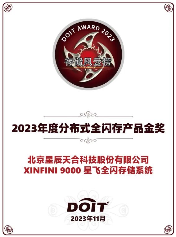 日前,由DOIT傳媒主辦的“2023 中國數據與存儲峰會”在北京召開,同期也發(fā)布了2023年度存儲風云榜,啟明創(chuàng)投投資企業(yè)XSKY星辰天合的星飛XINFINI 9000全閃分布式存儲系統(tǒng)憑借領先的架構設計和卓越的性能,榮獲了2023年度分布式全閃存產品金獎。