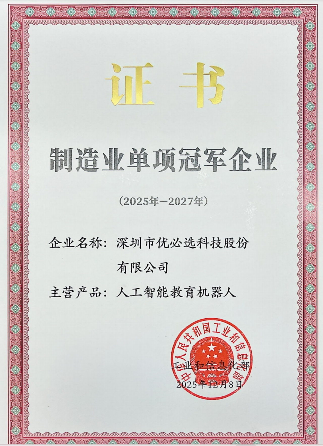 近日,啟明創(chuàng)投投資企業(yè)優(yōu)必選科技(09880.HK)憑借“人工智能教育機(jī)器人”在全球范圍的市場(chǎng)占有率優(yōu)勢(shì)、研發(fā)及制造領(lǐng)先性,順利通過(guò)工業(yè)和信息化部審核,獲得“國(guó)家級(jí)制造業(yè)單項(xiàng)冠軍企業(yè)(2025-2027)”榮譽(yù)。這一制造業(yè)領(lǐng)域的頂級(jí)榮譽(yù),代表了企業(yè)在特定細(xì)分市場(chǎng)中的全球領(lǐng)先地位,也是對(duì)公司在人工智能教育領(lǐng)域研發(fā)積累和技術(shù)創(chuàng)新能力的認(rèn)可。