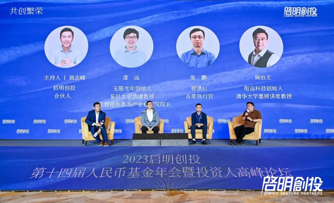 今年以來,ChatGPT大熱引發(fā)了市場對于生成式AI和大模型的高度關注。作為人工智能領域領先且活躍的創(chuàng)業(yè)投資機構,啟明創(chuàng)投早在該領域進行布局,投資了多家企業(yè)。在峰會《AI進入新時代:生成式AI》專題討論環(huán)節(jié),啟明創(chuàng)投合伙人周志峰擔任主持,與投資企業(yè)無限光年創(chuàng)始人、復旦大學浩清教授、人工智能創(chuàng)新與產(chǎn)業(yè)研究院院長漆遠,智譜AI首席執(zhí)行官張鵬,銜遠科技創(chuàng)始人、清華大學惠妍講席教授周伯文展開討論。