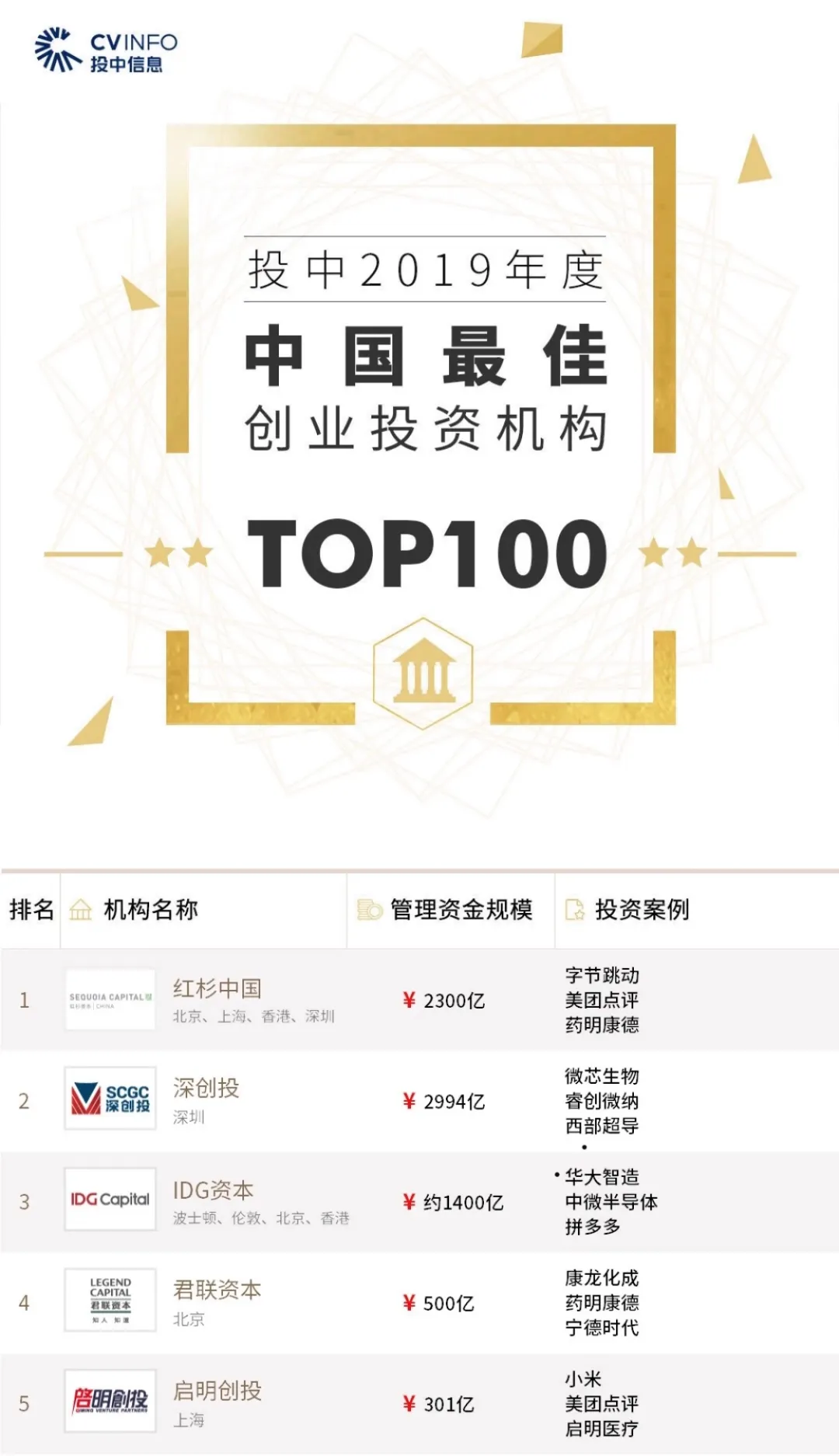在2019年度中國(guó)最佳創(chuàng)業(yè)投資機(jī)構(gòu)前100名中,啟明創(chuàng)投位列第五名。