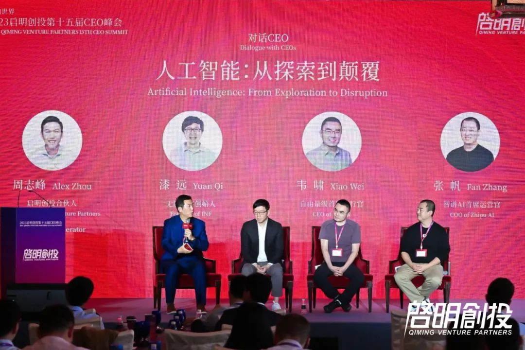 如果說2022年被稱之為生成式人工智能之年,那么2023年則是生成式人工智能進入通用人工智能創(chuàng)新應用的階段。在第一場對話CEO環(huán)節(jié),啟明創(chuàng)投合伙人周志峰與無限光年創(chuàng)始人、復旦大學人工智能創(chuàng)新與產(chǎn)業(yè)研究院院長、上海科學智能研究院院長漆遠,自由量級首席執(zhí)行官韋嘯和智譜AI首席運營官張帆三位杰出的投資企業(yè)的企業(yè)家,分別圍繞生成式AI時代是否會涌現(xiàn)出新的科技巨頭、未來訓練和推理成本、基座大模型商業(yè)化、模型應用一體化等相關問題進行了主旨演講及圓桌討論。