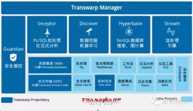 不僅是數(shù)據(jù)挖掘,星環(huán)提供的本質(zhì)是工具。如 Hadoop 生態(tài)中的 HDFS、MapReduce、Hive、HBase、YARN、ZooKeeper、Spark 等,星環(huán)就是在開源的基礎(chǔ)上改造這些組件,將不穩(wěn)定的部分改穩(wěn)定,將性能低下的部分提升性能,提供支持 SQL 標(biāo)準的接口,方便傳統(tǒng) RDBS 的業(yè)務(wù)往產(chǎn)品 TDH(Transwarp Data Hub)上轉(zhuǎn)移,等等,最終打造一站式平臺。TDH 由四部分組成, 包括 Transwarp Hadoop 基礎(chǔ)版、Transwarp Inceptor 交互式分析引擎、Transwarp Hyperbase 實時數(shù)據(jù)庫和 Transwarp Stream 流處理引擎。如下圖所示: