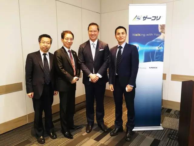 上市會合影(從左到右:艾德生物執(zhí)行副總 朱冠山,輝瑞日本副總 中村誠,默克日本總裁 Leo Lee,艾德生物國際業(yè)務(wù)總監(jiān) 黃青波)