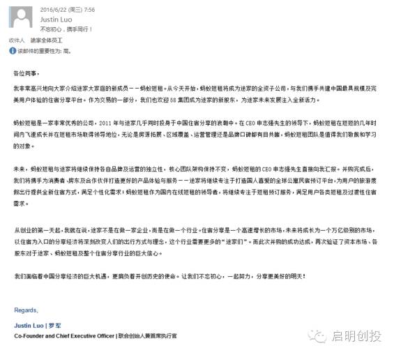 圖:途家聯(lián)合創(chuàng)始人兼CEO羅軍發(fā)全體員工的內(nèi)部郵件截圖