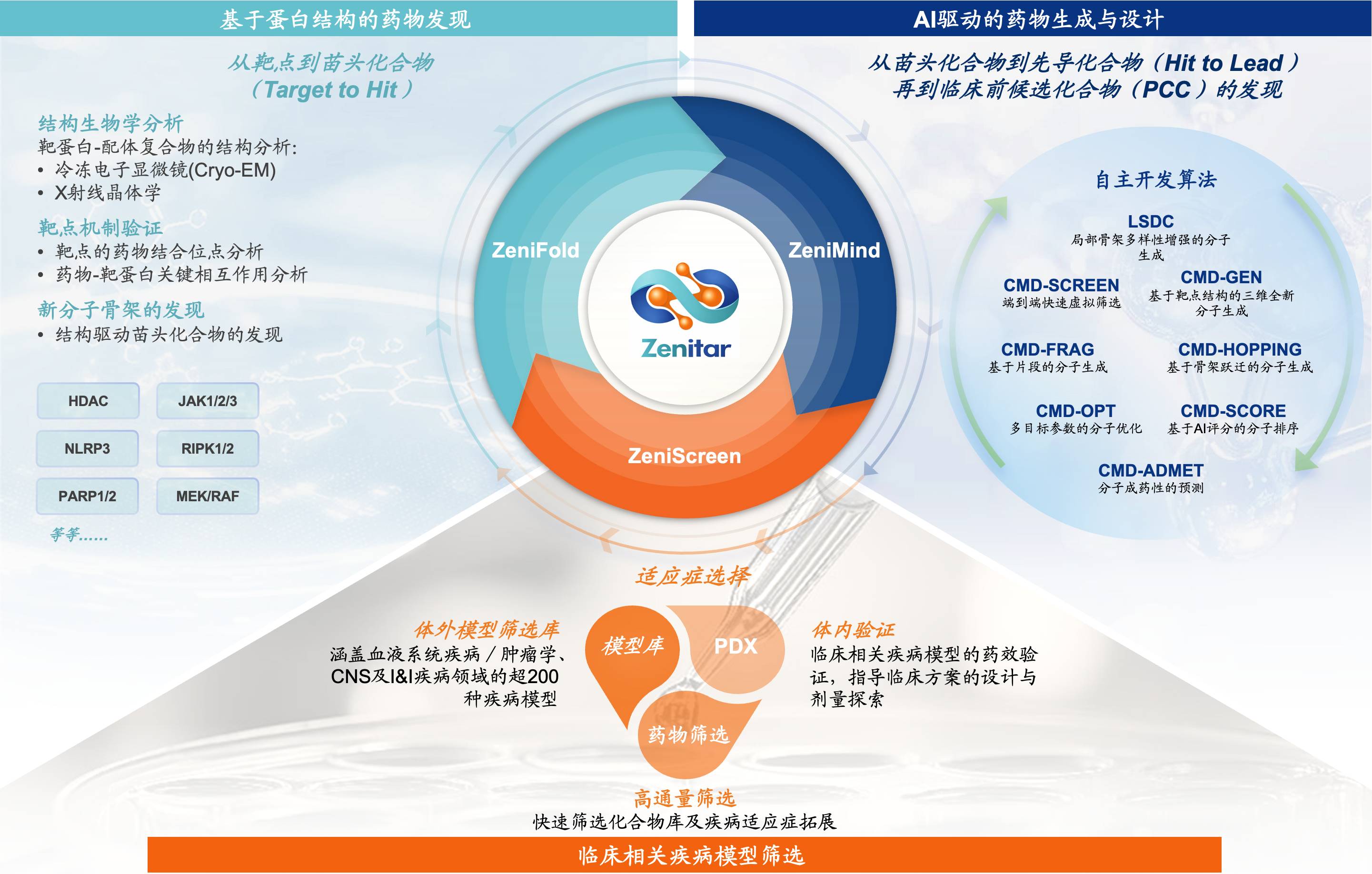 賾靈生物整合ZeniFold(結(jié)構(gòu)生物學(xué)平臺)、ZeniMind(AI藥物發(fā)現(xiàn)與設(shè)計平臺)與ZeniScreen(臨床相關(guān)疾病模型篩選平臺),構(gòu)建起“三維一體”的協(xié)同研發(fā)引擎,形成從靶點識別到分子設(shè)計再到藥效驗證的閉環(huán)迭代體系。ZeniFold依托高精度蛋白結(jié)構(gòu)解析,精準定位藥物結(jié)合位點并指導(dǎo)分子骨架設(shè)計;ZeniMind基于自主研發(fā)AI算法,實現(xiàn)分子的智能化生成與多目標參數(shù)優(yōu)化;ZeniScreen則借助臨床相關(guān)疾病模型,系統(tǒng)性完成藥效驗證與臨床轉(zhuǎn)化潛力評估。