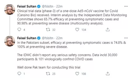 2021年2月8日,巴基斯坦總理特別助理費(fèi)薩爾·蘇丹(Faisal Sultan)推特發(fā)文稱,收到康希諾生物單劑Ad5-nCoV新冠疫苗的三期臨床試驗(yàn)數(shù)據(jù)。