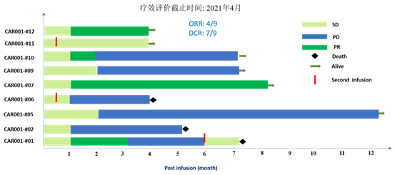 在已回輸的11例患者中,Ori-CAR-001顯示出了良好的安全性和耐受性。9例患者觀察到了細胞因子釋放綜合征(CRS),其中7例發(fā)生1-2級CRS,2例經靜脈回輸出現4級CRS,給予類固醇激素和托珠單抗治療后恢復正常。沒有觀察到神經毒性。