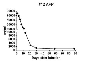 回輸28天后MRI結果顯示最大腫瘤直徑從133mm減少至9mm,縮小超過93%。目前,該受試者在回輸3個月后評估,MRI掃描結果顯示此腫瘤幾乎消失。相應地,回輸28天后其AFP(甲胎蛋白,診斷原發(fā)性肝癌特異性的腫瘤標志物)水平從>80000降至1148.9ng/ml,回輸3個月后降至746.7ng/ml(其正常值是在0-40ng/ml以內),展示了Ori-CAR-001在晚期肝癌治療的顯著有效性。